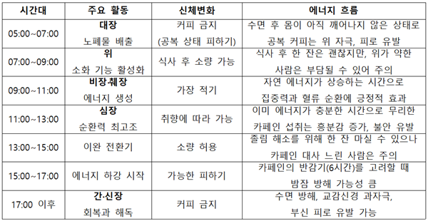 경희대한방병원 침구과 이재동 교수는 “아침 10시 이전의 커피는 상승하는 자연 에너지 흐름과 조화를 이뤄 집중력 향상과 신체 순환을 돕는다”며 “단 공복상태에서의 커피는 오히려 고갈된 에너지를 인위적으로 끌어쓰게 만들어 피로와 긴장을 유발할 수 있다”고 주의를 당부했다.