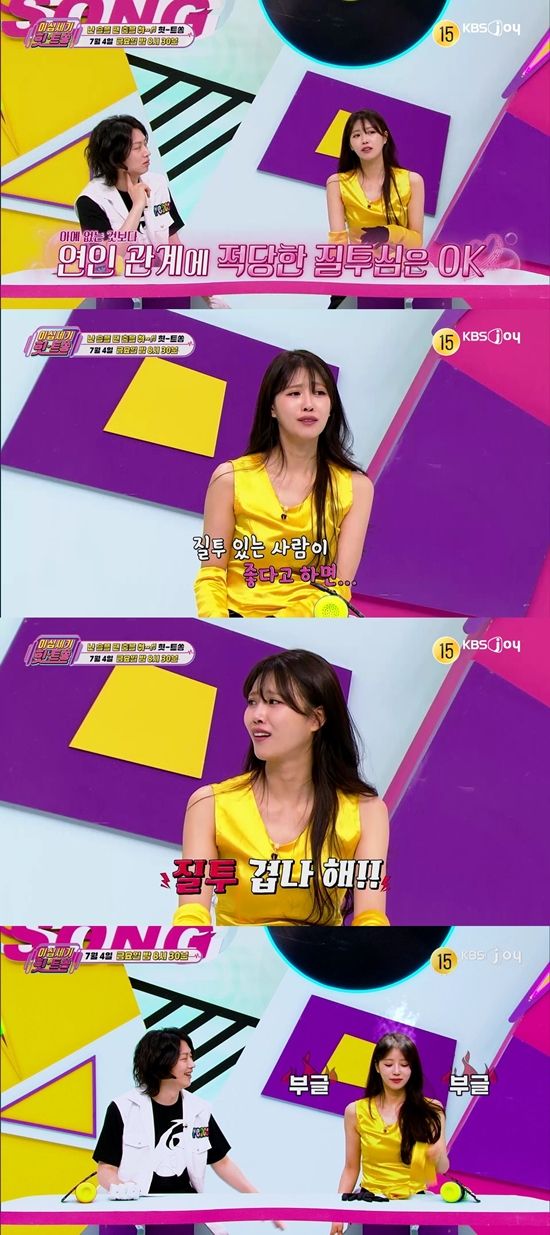 이어 이미주는 "너무 (질투) 없는 사람 만나보니까 질투 있는 사람이 좋다"며, "그런데 말 잘해야 하는 게, 방송에서 ‘질투 있는 사람 좋아해’ 이렇게 하면 질투를 엄청 한다"고 말한다. 이에 김희철은 "혹시 누가 보고 있냐"고 너스레를 떨어 분위기를 유쾌하게 만든다.