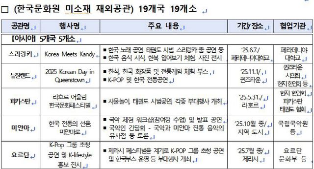 △주워싱턴한국문화원은 올니극장과 협력해 드라마 ’김씨네 편의점‘을 연극으로 재구성한 메릴랜드 공연(6월, 7월)을 계기로 한국문화 행사를 진행한다. △주LA한국문화원은 글로벌푸드엔터테인먼트그룹 컵밥과 함께 9월 ‘2025년 코리안 페스티벌’(유타)을 공동 개최하는 등 다양한 기관과 협업해 한류 확산의 토대를 넓혀갈 계획이다.