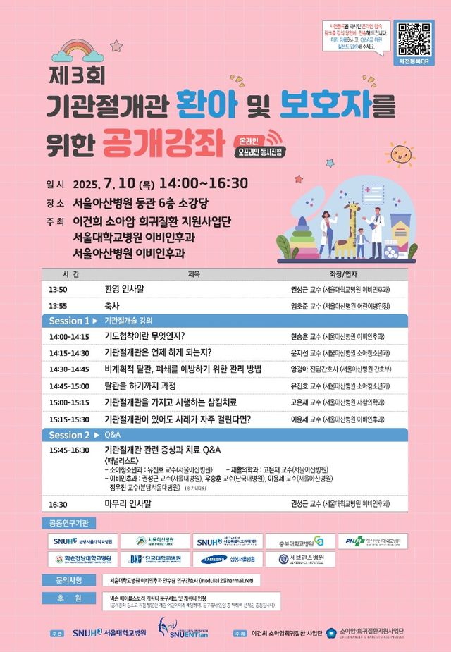 서울대학교병원 이비인후과는 오는 10일 오후 14시분부터 서울아산병원 동관 소강당에서 ‘제3회 기관절개관 환아 및 보호자를 위한 공개강좌’를 개최한다. 이번 강좌는 이건희 소아암·희귀질환사업단의 지원으로 마련됐다.