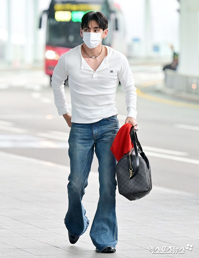 슬림한 상체를 감싸는 티셔츠는 넓게 벌어진 어깨와 균형 잡힌 피지컬을 더욱 돋보이게 했고, 과감한 플레어 팬츠는 긴 다리 라인을 극대화하며 완벽한 비율을 드러냈다. 블랙 로퍼와 레드 컬러 아우터, 클래식한 패턴의 보스턴백은 전체적인 스타일에 무게감을 더했다.