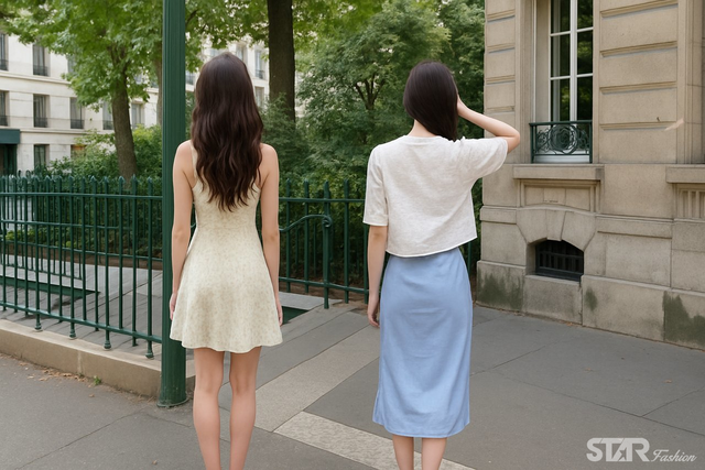 첫 번째 원피스 스타일은 프렌치 무드를 담은 옐로 플라워 패턴 미니 드레스로, 얇은 스트랩과 바디라인을 살린 핏이 시원하면서도 여성스러운 분위기를 자아낸다. 특히 레드 플랫슈즈를 포인트로 매치해 발랄한 느낌을 더했으며, 배경이 되는 파리 거리와 어우러져 마치 영화 속 한 장면 같은 우아한 장면을 연출했다.