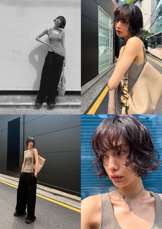 공개된 사진 속 나나는 얇은 베이지 컬러 슬림핏 민소매 톱에 블랙 와이드 팬츠를 매치해 시크하면서도 감각적인 스트리트룩을 완성했다.