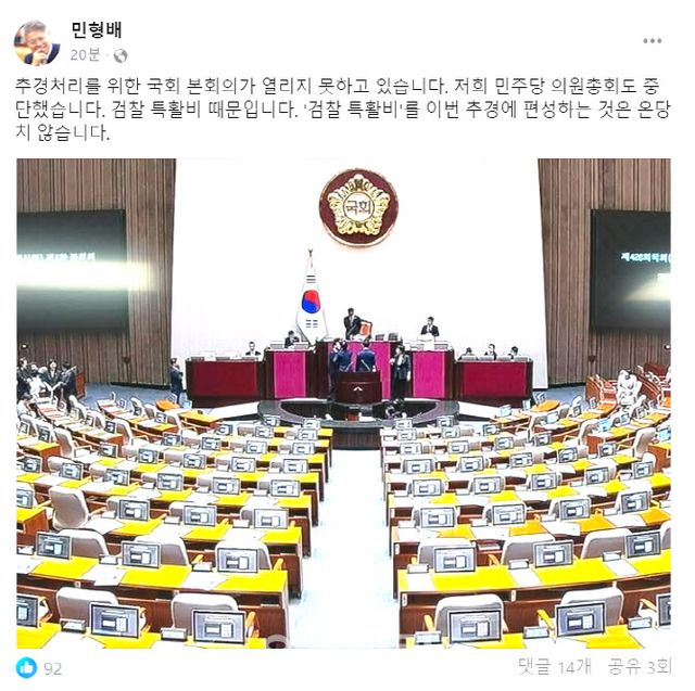 하지만 본회의를 열기 전 의원총회에서 일부 검찰특활비와 관련해 반대 의견이 나온 것으로 알려진다. 민형배 민주당 의원은 이날 자신의 소셜네트워크서비스(SNS)를 통해 “추경처리를 위한 국회 본회의가 열리지 못하고 있으며, 저희 민주당 의원총회도 중단했다”면서 “‘검찰 특활비’를 이번 추경에 편성하는 것은 온당치 않다”고 지적했다.