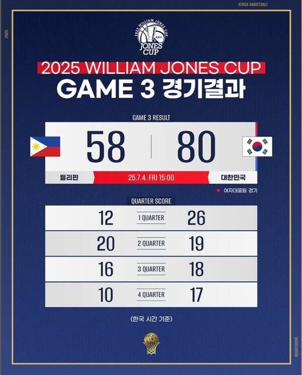 뉴시스 보도에 따르면, 박수호 감독이 이끄는 여자 농구 대표팀은 4일 대만 타이베이의 허핑 농구체육관에서 열린 대회 여자부 3차전에서 필리핀을 80-58로 완파했다.