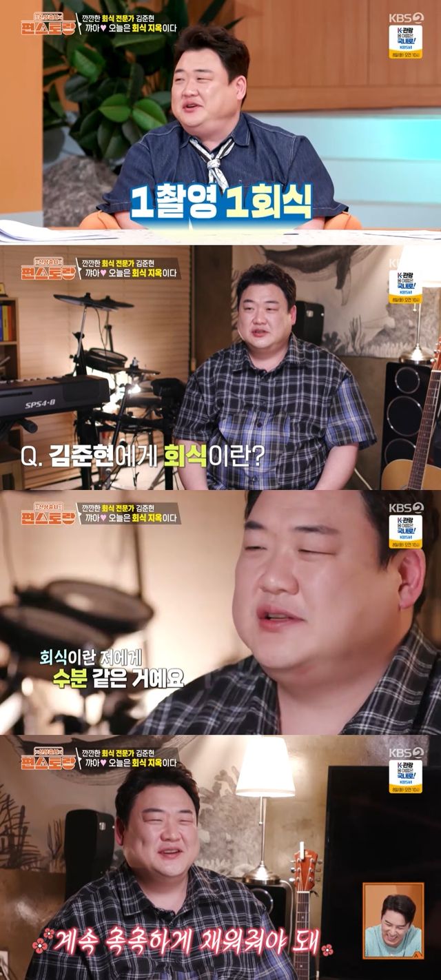 이에 제작진은 김준현에게 회식이란 어떤 것이냐고 물었고, 김준현은 "회식이란 저한테 수분 같은 거다. 촉촉하게 채워줘야 한다"라고 전했다.