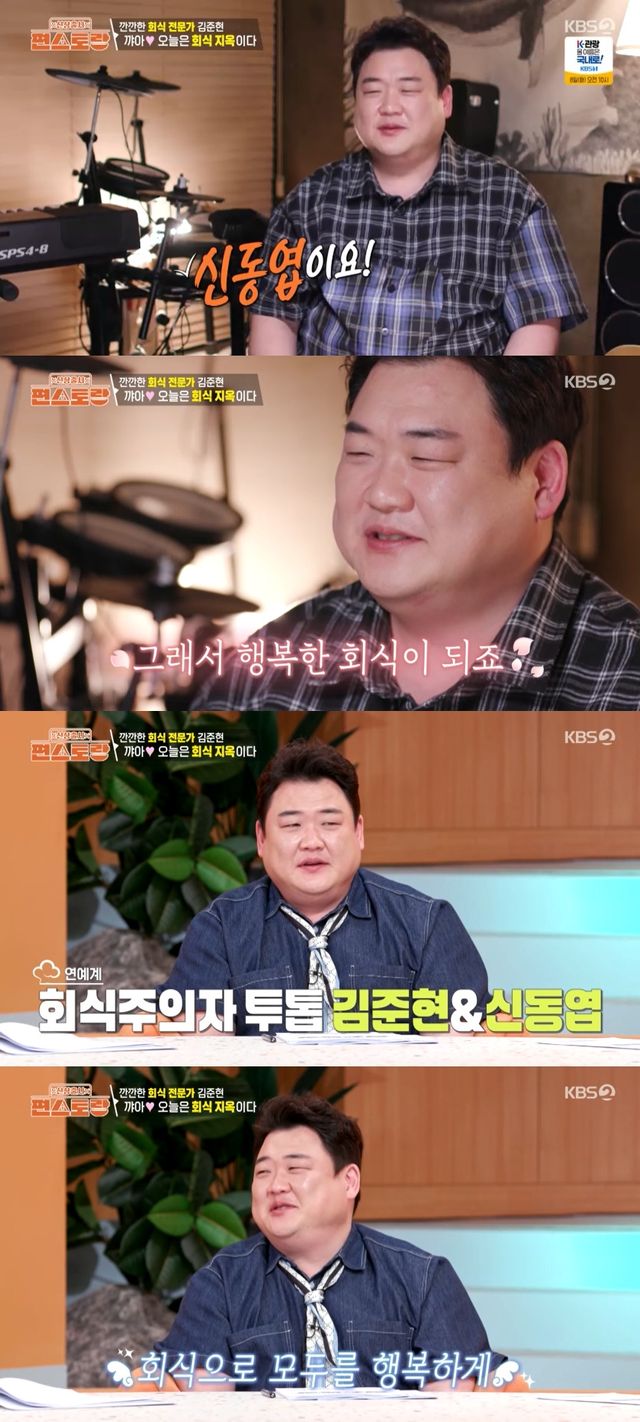 이를 본 붐은 "신동엽 씨랑 쌍벽을 이루게 회식을 사랑한다. 그리고 사람들이 행복하게 먹는 모습을 보고 되게 좋아한다"라고 전했다.