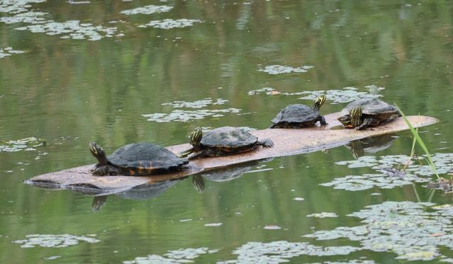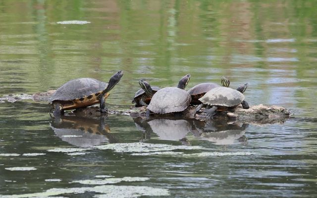 물이 빠지며 드러난 흙더미 위에도 붉은귀거북 4마리가, 경포아쿠아리움 부근의 비교적 큰 바위에도 크기가 다른 2마리가 올라와 쉬는 모습이 관찰됐다. 송전탑 부근에서는 작은 널빤지 위에 3∼4마리가 올라앉아 마치 뱃놀이를 즐기는 것처럼 보이기도 했다. 흙이 드러난 곳에서도 2∼3마리씩 일광욕을 즐기는 모습을 볼 수 있었다. 흙이나 돌, 나뭇가지 등 올라갈 곳을 찾지 못한 일부는 작은 스티로폼 올라앉거나 쓰러진 갈대 위에서 일광욕을 했다.