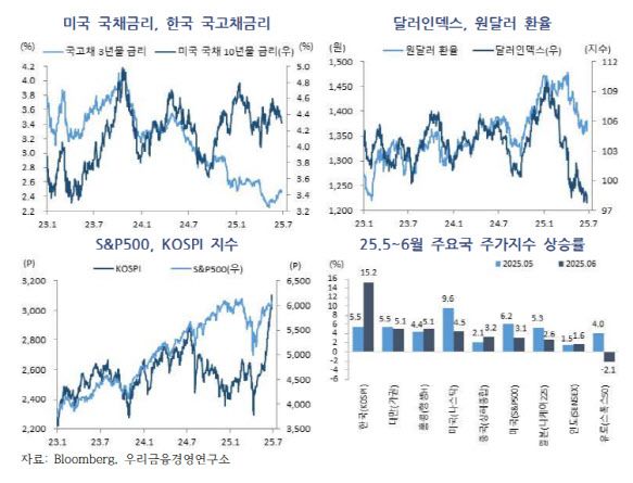 원/달러 환율은 1350원대에 머물 것으로 내다봤다. 중동지역 긴장 완화에 따른 달러 약세와 미 통상협상 타결 기대, 외국인 국내 주식 매수세 등의 영향을 받을 것으로 분석했다.
