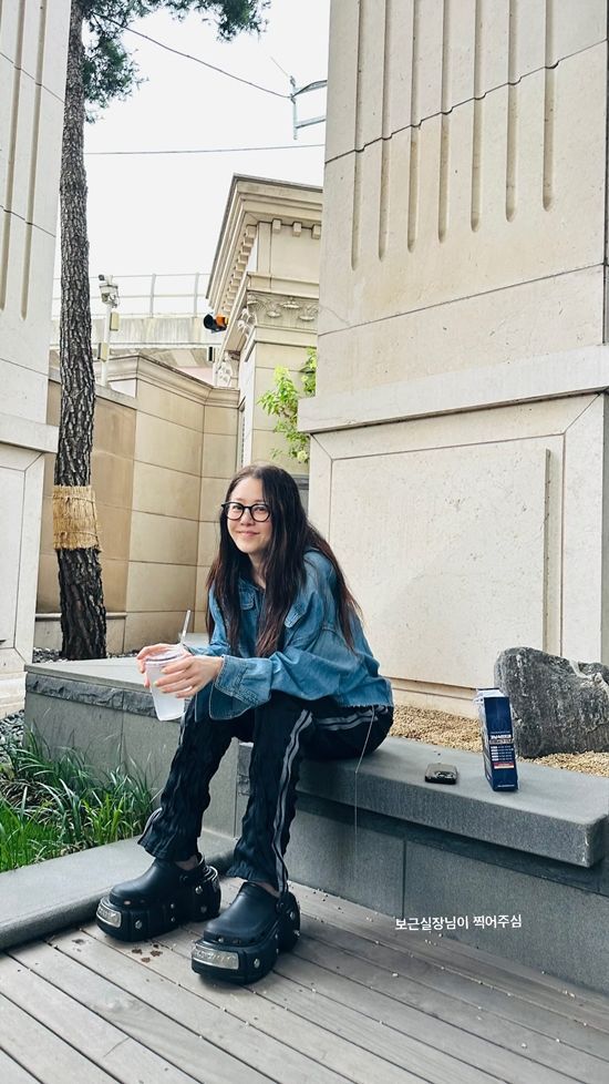 사진 속 고현정은 청재킷과 트레이닝 팬츠 차림으로 벤치에 앉아 음료를 들고 미소 짓고 있다.