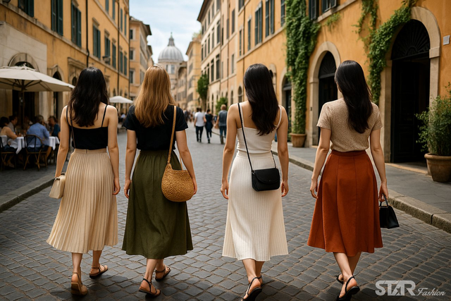 이처럼 유럽의 풍경과 완벽하게 어우러지는 플리츠·롱·A라인 스커트는 여름 여행 스타일링에서 빼놓을 수 없는 아이템이다. 발걸음마다 드레시한 실루엣이 더해지고, 다양한 상의·슈즈와의 매치도 쉬워 실용성까지 겸비했다.