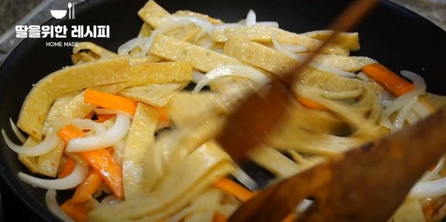 팬에 식용유를 두르고 중불로 달군 뒤, 양파부터 볶는다. 향이 올라오기 시작하면 어묵을 넣고 함께 볶다가 물 3~4큰술, 간장 1작은술, 설탕 1작은술, 후추 약간을 넣고 잘 섞는다.