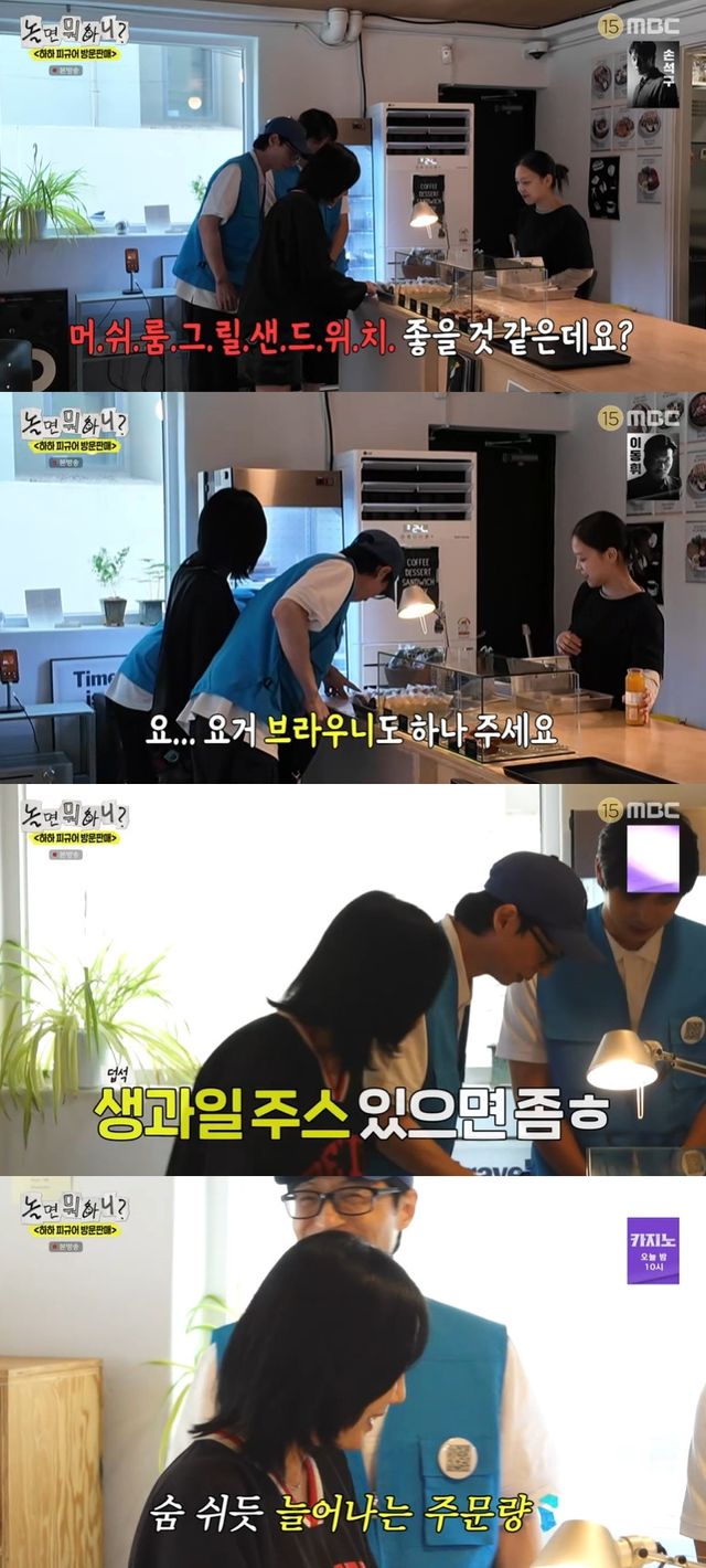 먼저 편하게 주문부터 하라는 말에 별은 머쉬룸 그릴 샌드위치와 브라우니를 선택했다. 이에 유재석은 "음료는 주문 안 하냐"고 물었고, 별은 "생과일 주스 있으면 좀"이라며 "오빠 그 정도는 괜찮잖아요"라고 말했다.