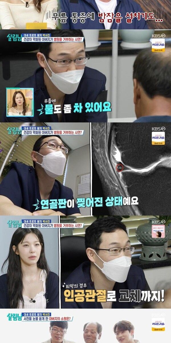 병원에 도착해 아버지의 무릎 상태를 살피던 의사는 "무릎에 물도 좀 차있다"고 진단한 뒤 MRI 촬영을 권했다. 정밀 검사 결과, 의사는 "관리받고 있는 당뇨로 인해 염증 관리가 잘 안 되고 있다. 입원해서 치료를 받는 게 나을 것 같다"고 제안했다. 이어 의사는 "상태가 그렇게 좋지 않다. 무릎 안쪽에 있는 연골판이 찢어진 상태다. 그리고 연골이 많이 손상됐고 관절염이 진행되고 있다. 최악의 경우 인공관절로 교체까지 해야 한다"고 아버지의 심각한 상태를 구체적으로 설명했다. 이에 박서진은 "순간 가슴이 덜컹 내려앉았다"라며 충격을 감추지 못했다.