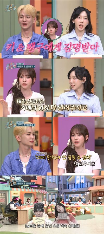 카리나는 "태연 선배님 같은 경우에는 아까도 카메라 위치 다 알려주시고, (키는) '이때 말해야 안 묻힐 수 있어' 이런 거 알려주셨다"며 훈훈한 SM엔터테인먼트의 선후배 관계를 뽐냈다.