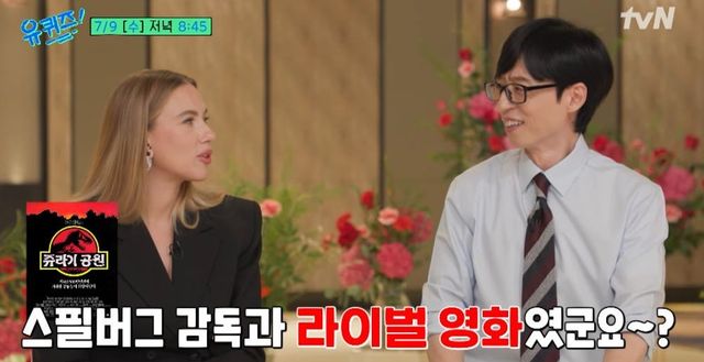 이에 조세호가 “여기 유재석도 과거 공룡영화를 찍었다”며 1994년작 ‘영구와 우주괴물 불괴리’를 입에 올리자 조핸슨은 “스티븐 스필버그 감독의 ‘쥬라기 공원’과 라이벌 영화였겠다. 나중에 같이 공룡 영화를 찍자”라고 권해 유재석을 웃게 했다.