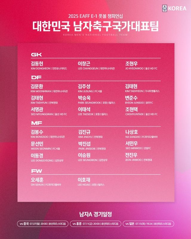 홍명보 감독이 이끄는 한국 축구 국가대표팀은 오는 7일부터 16일까지 열리는 2025 동아시아축구연맹(EAFF) E-1 챔피언십(동아시안컵)에 참가한다.