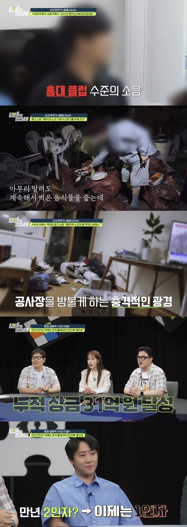 갈매기 탐정단은 여러 차례 해당 층간소음 가해자와 직접 대화를 시도했지만, 그의 격렬한 거부로 모두 실패로 돌아간다. 그러던 중 층간소음 가해자의 노모가 아파트 쓰레기장에서 음식물 쓰레기를 주워가는 모습이 ‘탐정들의 영업비밀’ 카메라에 포착된다. 갈매기 탐정단의 만류에도 불구하고 계속 쓰레기를 뒤지는 모습에 모자(母子)의 안전이 걱정되는 상황이었다. 이에 ‘탐정들의 영업비밀’은 이웃 주민의 협조를 구해 모자(母子)의 집안 내부를 살피기 위해 들어간다. 그런데 눈앞에 펼쳐진 집안 상태는 공사장을 방불케 할 정도로 심각해 모두가 말을 잇지 못한다. 3년간 주민들을 공포에 떨게 만든 역대급 층간소음 가해자와 노모에 얽힌 더욱 자세한 이야기는 ‘탐정들의 영업비밀’ 본방송을 통해 확인할 수 있다.
