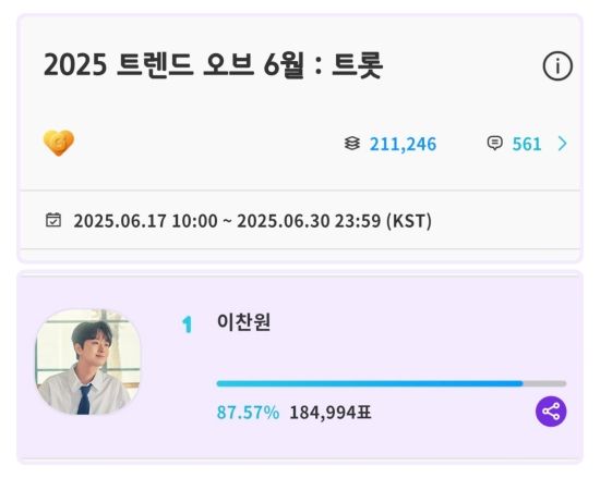 올해에도 2025년 5월과 6월 트롯 부문 투표에서 1위를 달성한 이찬원. 이를 통해 팬덤의 꾸준한 지지와 남다른 인기를 입증했다.