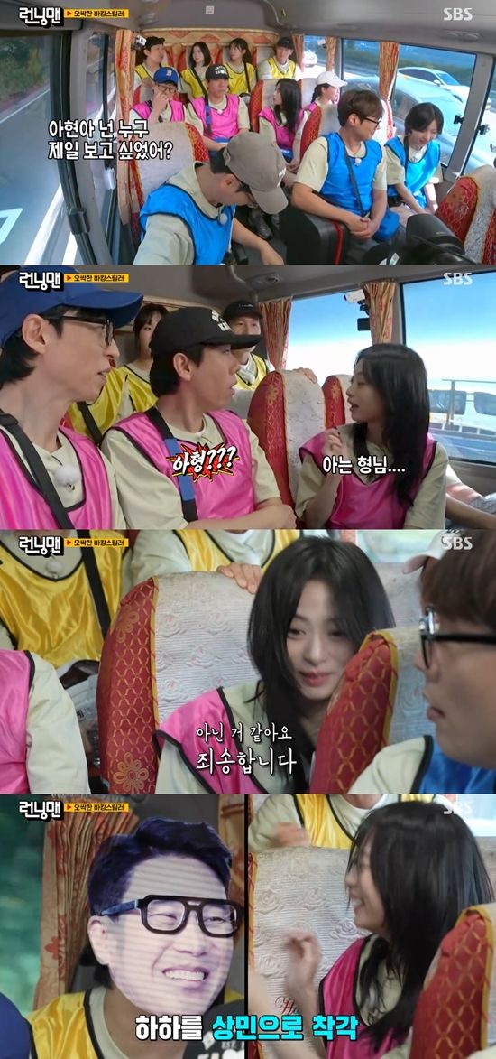 하하가 아현에게 "너는 여기서 누가 제일 보고 싶었냐"라고 질문했다. 아현이 "저는 (하하) 선배님이다"라고 답하자, 런닝맨 출연진들이 "거짓말하지 마라. 이유를 들어보자"라고 말했다.