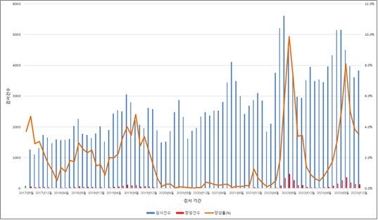 분석결과 국내 사포바이러스 감염률은 코로나19 유행 전인 2017년부터 2019년까지 월간 최대 4.7%였고, 코로나 팬데믹 기간이었던 2020년과 2021년에는 월평균 0.3%로 매우 낮은 수준을 보였다. 그러나 사회적 거리두기가 해제된 2022년 여름 이후 월간 감염률이 2배 가까이 증가해 2022년 8월에는 9.9%, 2023년 9월에는 8.1%로 치솟았다.
