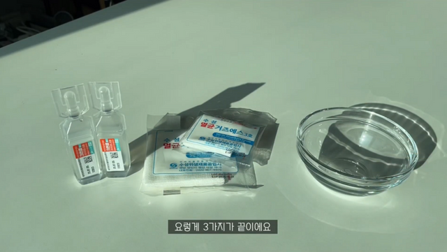 가장 먼저 필요한 건 멸균 식염수와 거즈. 멸균 식염수의 경우, 대용량보다는 개별포장된 제품이 위생상 유리하고, 냉장 보관 시엔 24시간 이내에 사용할 분량만 덜어 써야 한다. 가끔 렌즈 식염수랑 헷갈리는 이들이 있는데 멸균 식염수랑은 엄연히 다른 성분의 제품이라 주의가 필요하다.