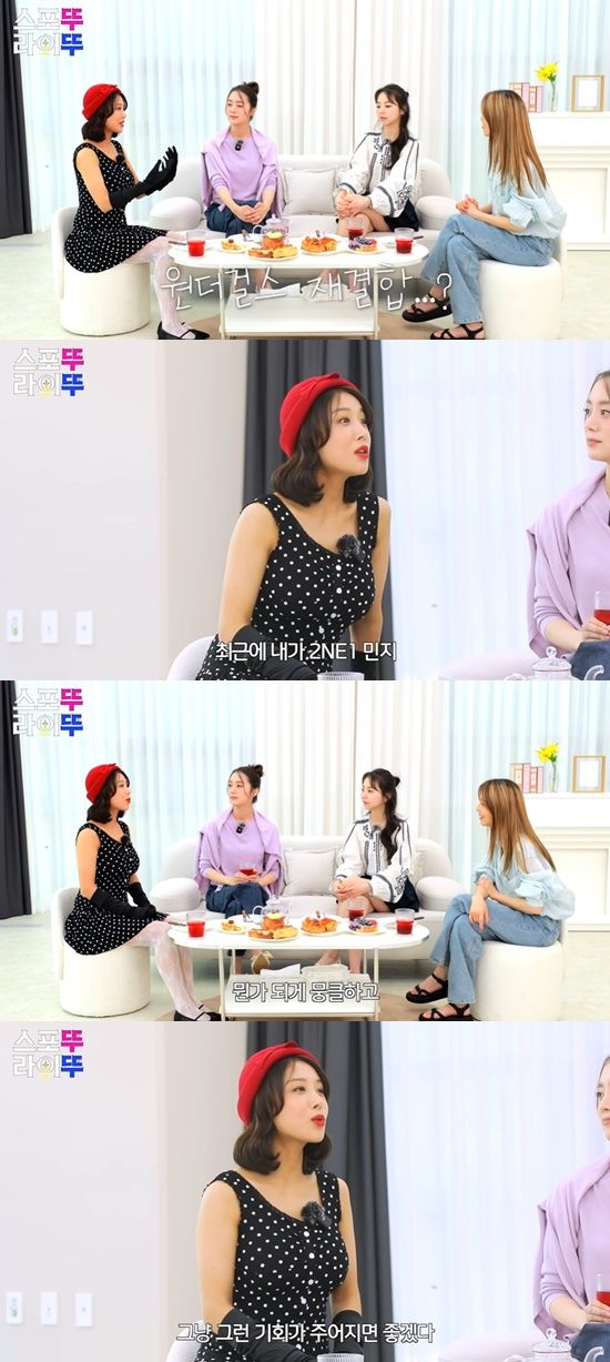 그는 최근에 투애니원(2NE1) 완전체 콘서트를 갔었다며 "민지랑 같이 축구('골때녀') 했었으니까. FC 탑걸 멤버였으니까"라며 "뭔가 되게 뭉클하고 예쁘고 멋있더라. 그래서 우리도 좋은 기회가 되면 재결합해도 좋겠다, 그냥 그런 기회가 주어진다면 좋겠다는 생각을 하게 되더라"고 말했다.