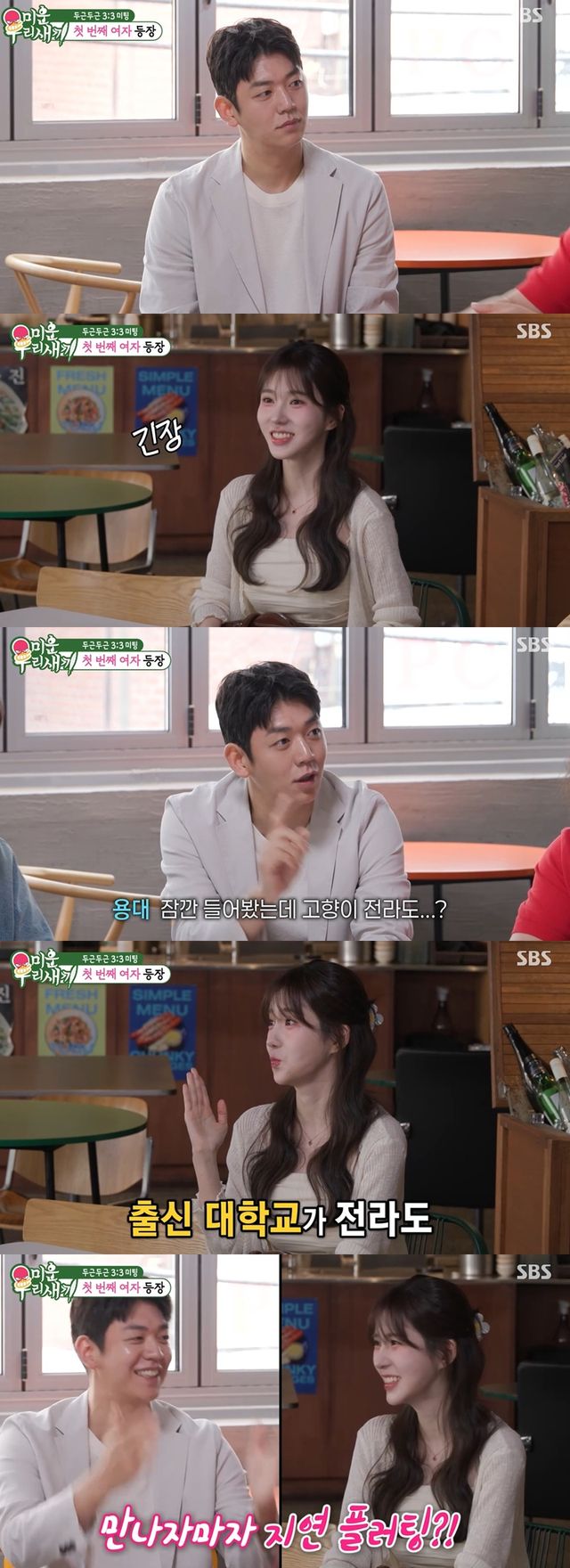 세 사람은 소개팅 자리에서 여성을 기다렸고, 곧 첫 번째 미팅녀가 등장했다. 그녀의 미모에 서장훈은 "미인이시네"라며 감탄했고, 세 남자도 놀라운 반응을 보였다. 최진혁은 자리에서 일어나 인사를 건넸고, 이를 본 이용대는 "먼저 일어나네"라고 말하며 뒤따라 일어섰다.