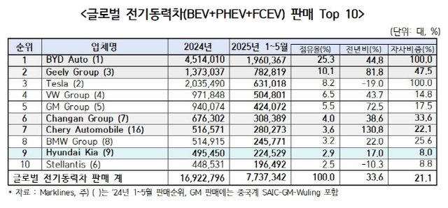 7일 한국자동차모빌리티산업협회(KAMA)가 발표한 ‘2025년 1~5월 글로벌 전기동력차 시장현황’ 보고서에 따르면 올해 전 세계 전기동력차(BEV·PHEV) 판매량은 약 773만 대로, 전년 동기 대비 33.6% 증가했다.