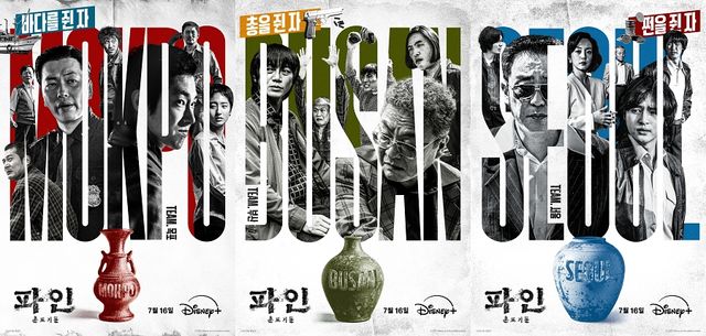 1977년, 바다 속에 묻힌 보물선을 차지하기 위해 몰려든 근면성실 생계형 촌뜨기들의 속고 속이는 이야기 ‘파인: 촌뜨기들’이 신안 앞바다를 무대로 펼쳐질 18인의 치열한 수 싸움을 예고하는 그룹 포스터 3종을 공개했다. ‘SEOUL’, ‘MOKPO’, ‘BUSAN’으로 구성된 이번 포스터는 각 지역을 대표하는 인물들이 한 데 모인 강렬한 비주얼로 시선을 사로잡는다. 특히 하단에 배치된 지역별 도자기는 각기 다른 욕망을 품은 이들이 얽히게 되는 이야기의 시작점이자 중심인 보물을 상징적으로 드러낸다.