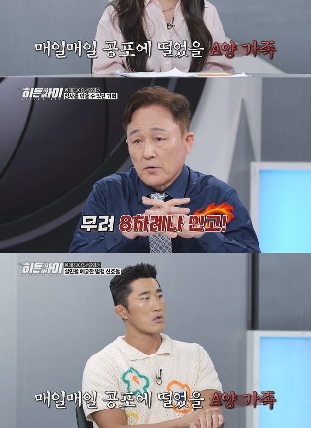 라이브 이슈에서는 본인이 살던 아파트에 불을 지른 뒤, 대피하던 주민들을 무자비하게 공격해 22명의 사상자를 낸 ‘안인득 사건’을 다룬다. 주변 사람들이 자신을 무시한다고 생각한 안인득은 자신이 살해할 대상을 정하기까지 했다. 윗집에 살던 고등학생 시각장애인 A 양에게 지속적으로 욕설을 퍼붓고, 심지어 A 양의 집 현관에 오물을 끼얹는 등 극심한 괴롭힘을 일삼았다. A 양의 가족은 안인득이 현관 앞까지 쫓아오는 모습이 담긴 CCTV를 경찰에 제출하며 여러 번 도움을 요청했지만, 신변 보호 요건을 판단하기 어렵다는 이유로 당시 아무런 보호 조치를 받지 못했다고. 결국, A 양이 안인득의 손에 목숨을 잃은 끔찍한 상황에 윤보미는 “지옥 같았겠다”라며 고개를 떨궜고, 김동현은 “아무런 도움을 받지 못하고 살해당한 A 양이 너무 안타깝다”라며 참담함을 감추지 못했다. 수차례의 신고와 반복된 위험 신호에도 막지 못한 참극에 대해 3COPS가 심층 분석한 이번 방송은 7월 7일 월요일 저녁 7시 40분, MBC 에브리원 ‘히든아이’에서 확인할 수 있다