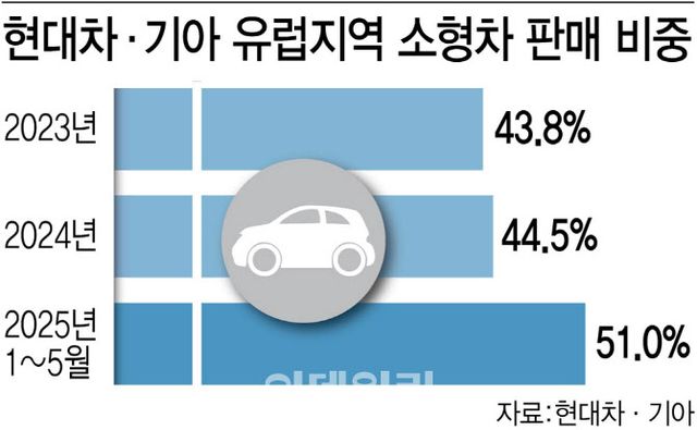 전체 차량 중 소형차 비중이 40%에 가까울 정도로 작은 차량에 대한 선호도가 높은 유럽 시장에서 현대차·기아의 소형차 판매 비중은 2023년 43.8%, 2024년 44.5%로 꾸준히 증가하는 중이다.