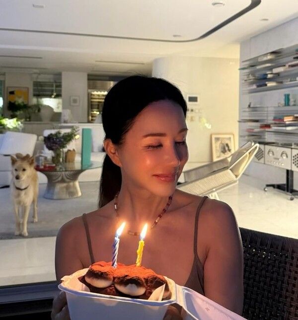 사진 속 엄정화는 테라스와 거실에서 케이크를 앞에 두고 포즈를 취하고 있다.