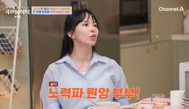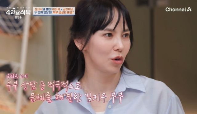 이어 박경림은 김히어라 대신 “결혼 13년 차 부부가 이렇게 사이가 좋을 수 있냐. 쇼윈도 부부가 아니냐는 의혹이 있다”라고 질문했다. 이에 김지우는 부부의 관계를 위해 노력을 많이 했다고 밝혔다. 김지우는 “저희는 사이가 좋아지려고 정말 노력을 많이 했다. 결혼 1년 차, 출산 등 고비가 많이 왔다. 근데 저희는 부부상담도 받으면서 지혜롭게 넘긴 것 같다”라고 고백했다.