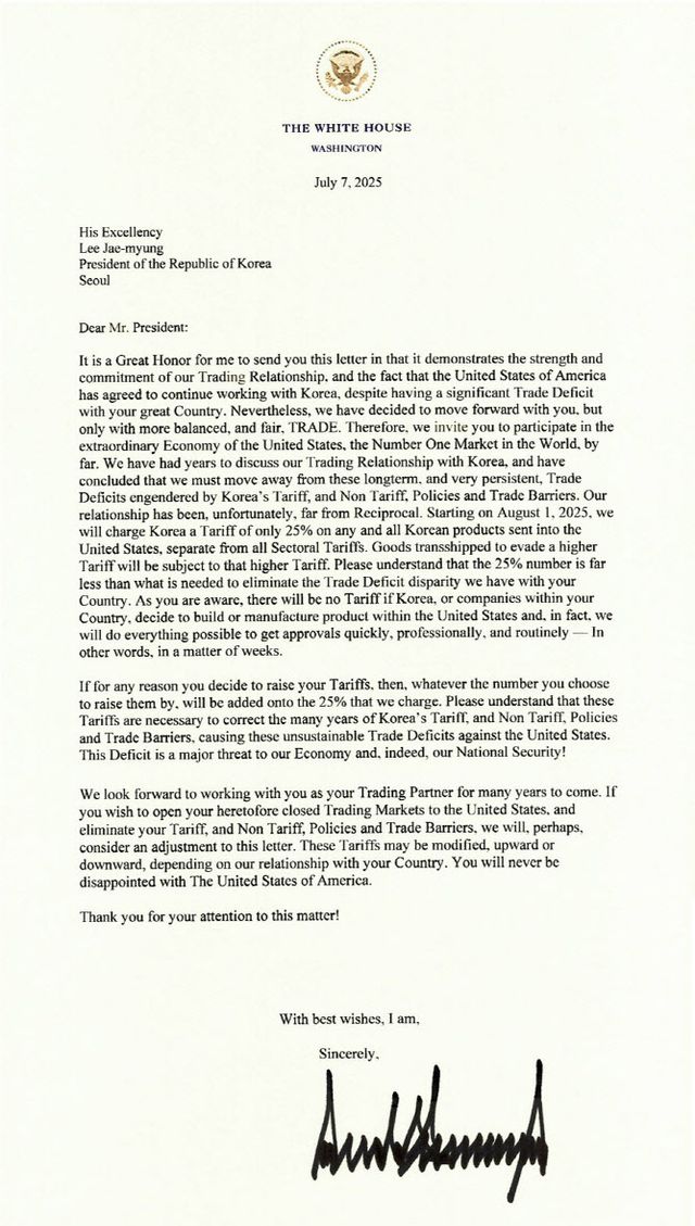 트럼프 대통령은 이날 이재명 대통령 앞으로 공식 서한을 보내서 오는 8월 1일부터 모든 한국산 제품에 대해 25%의 관세를 부과하겠다고 통보했다. 또 관세·비관세 장벽 철폐시 관세율을 조정할 수 있다며 빠른 협상을 압박했다.
