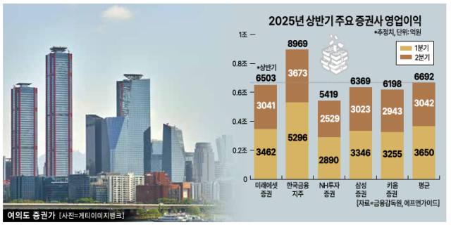 7일 금융정보업체 에프앤가이드에 따르면 컨센서스(증권사 평균 추정치)가 형성된 미래에셋증권, 한국금융지주, NH투자증권, 삼성증권, 키움증권 등 주요 증권사 5곳의 상반기 영업이익은 평균 6672억원으로 추정된다.