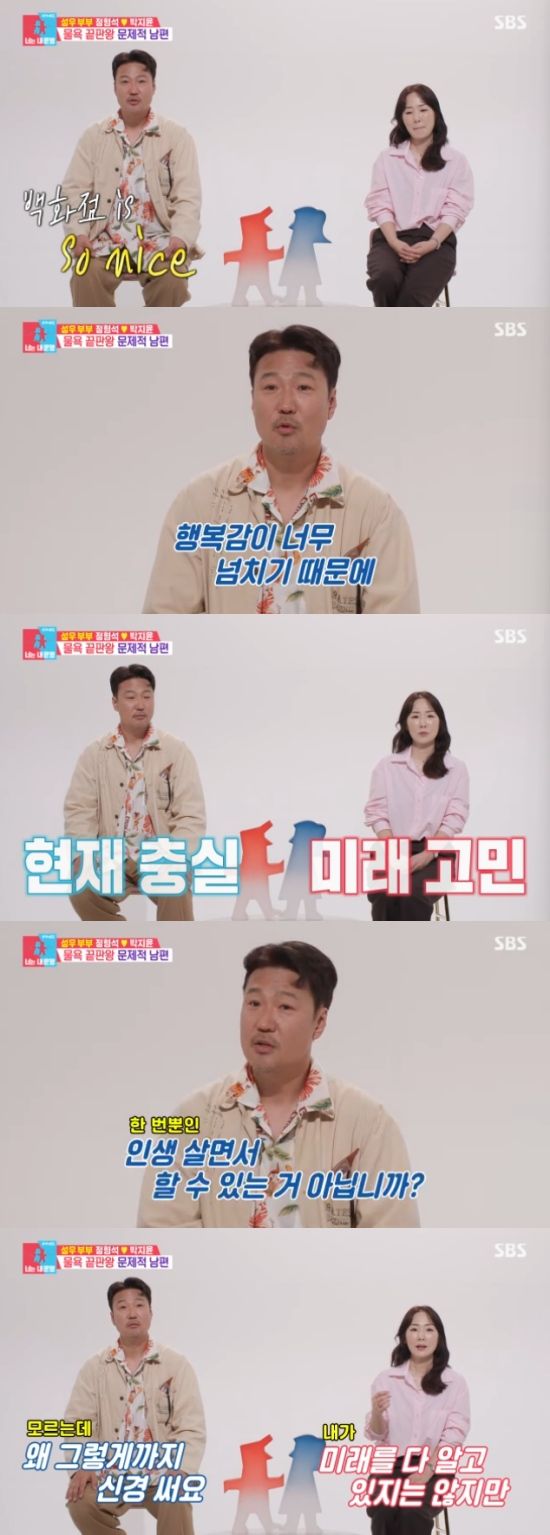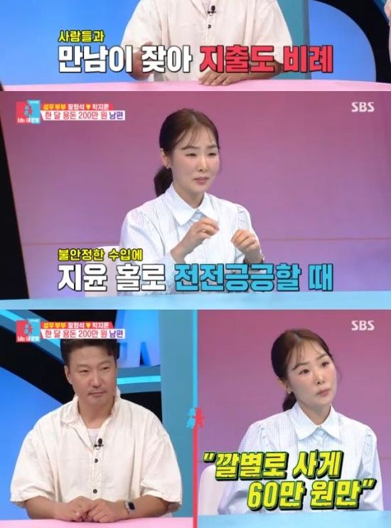 그럼에도 정형석은 "내가 좋아하는 것들, 좋아하는 사람들과의 시간을 보내기에는 약간 부족하다"고 했고, 박지윤은 "지금 오빠가 하고 싶은 것을 다 하고 있지 않냐. 내가 재정 상황을 매번 보여줘도 오빠는 계속 그걸 잊는다. 나는 내 가족이 먼저인데 오빠는 아닌 것 같다"면서 참았던 눈물을 보이기도 했다.