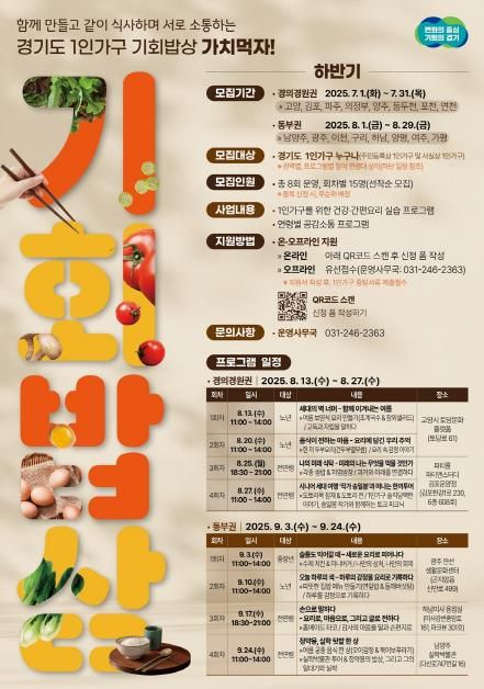 [파이낸셜경제=김영란 기자] 경기도가 ‘2025년 1인가구 기회밥상’ 하반기 프로그램에 참여할 1인 가구를 모집한다.