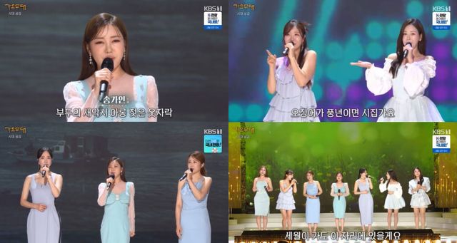 강예슬, 김나희, 김소유, 김희진, 두리, 송가인, 숙행은 지난 7일 방송된 KBS1 ‘가요무대’에 출연해 감성과 에너지를 넘나드는 무대를 선보였다. 이날 방송은 ‘미스트롯’ 시즌 1 출신 가수들이 다시 한자리에 모여 완벽한 호흡을 자랑한 특별한 무대였다.