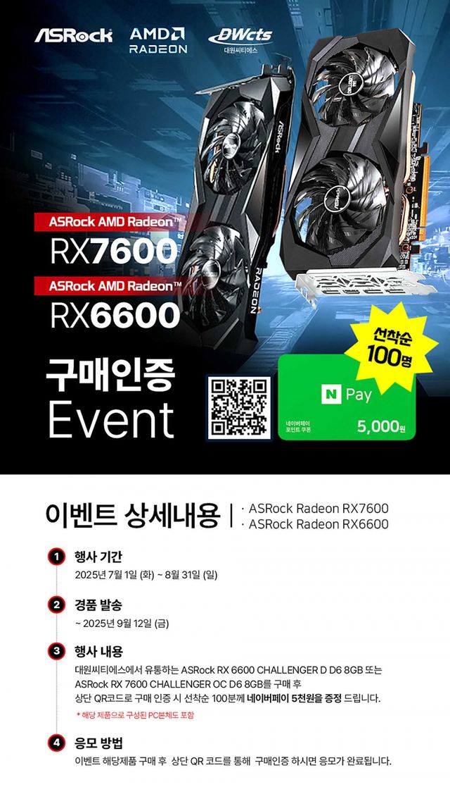 대원씨티에스가 ASRock 라데온 RX6600 및 RX7600 그래픽카드 구매자를 대상으로 구매 인증 이벤트를 진행한다. 응모 기간은 7월 1일부터 8월 31일까지이며, 대상 제품 구매 후 인증을 완료한 선착순 100명에게 네이버페이 포인트 5,000원이 지급된다.