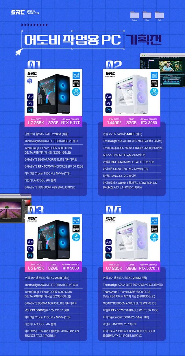 상위 모델은 인텔 코어 울트라7 265K 프로세서와 RTX 5070 또는 5070 Ti 그래픽카드를 기반으로 고해상도 영상 및 이미지 편집 작업에 적합하다. 중간급 모델은 울트라5 245K와 RTX 5060, 엔트리급 모델은 14세대 i5 14400F와 RTX 3050을 탑재해 일반적인 편집 및 디자인 작업을 효율적으로 지원한다.