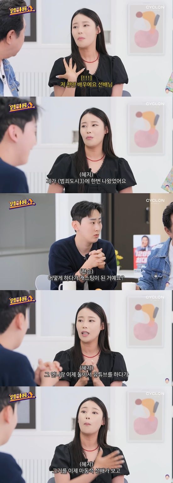 이혜지는 "제가 '범죄도시3'에 나왔었다. 마동석 선배님이랑 마주치는 신에 나왔다"며 "개그우먼 중에 연예림이라는 언니가 있는데, 그 언니랑 둘이서 유튜브(삐빠빠룰라)를 했었다. 요즘 여성분들처럼 클럽 좋아하는 모습들 등을 담았었는데, 그걸 이제 마동석 선배가 보고 캐스팅 제의가 왔다"고 설명했다.