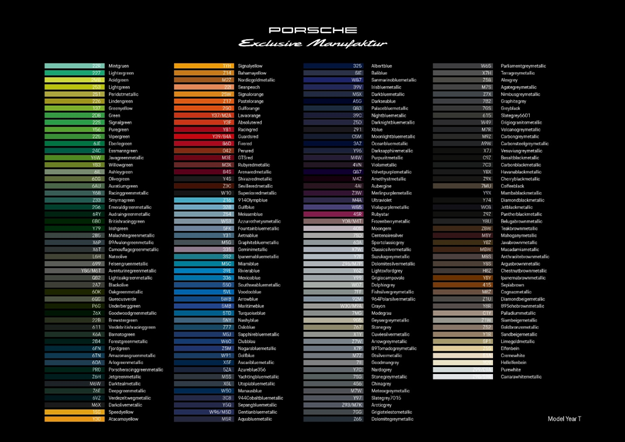 모든 포르쉐 고객은 차량 주문 시 최소 2가지 이상 개별화 옵션을 선택할 수 있으며, 페인트 투 샘플(Paint to Sample)과 같은 고급 페인트 프로그램을 통해 170가지 이상의 컬러 중 선택하거나, 페인트 투 샘플 플러스(Paint to Sample Plus)를 통해 거의 무제한의 색상을 지정할 수도 있다.