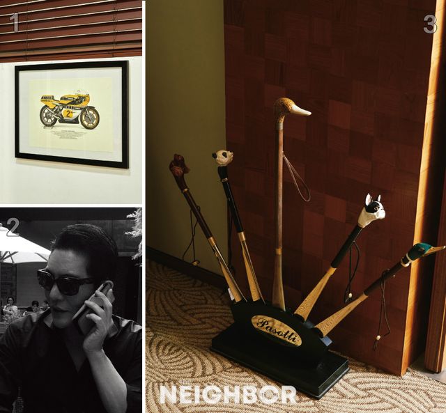 1 모터사이클 디자인을 구체화한 스케치. 2 컴파스로즈 허자홍 대표. 3 허자홍 대표가 수집한 구둣주걱. 정교한 조각이 돋보인다.