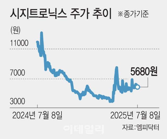 8일 금투업계에 따르면 시지트로닉스는 이날 전거래일 대비 0.35% 내린 5680원에 거래를 마쳤다. 연초 이후 수익률은 4.6%대에 그쳐 같은 기간 코스닥 수익률(15.64%)에는 미치지 못했다.