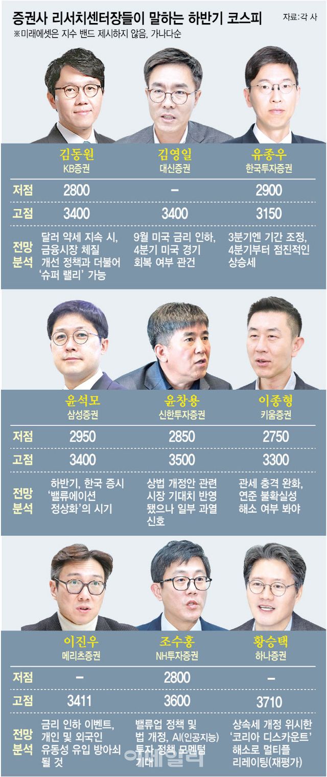 윤석모 삼성증권 리서치센터장은 2950~3400을 제시하며 “2025년 하반기를 한국 증시 ‘밸류에이션 정상화’의 시기로 본다면, 현재 9.5%의 ROE(자기자본이익률)에 적정한 수준인 P/B(주가순자산배수) 1배를 중심으로 주가 밴드가 형성될 가능성이 높다”고 판단했다.