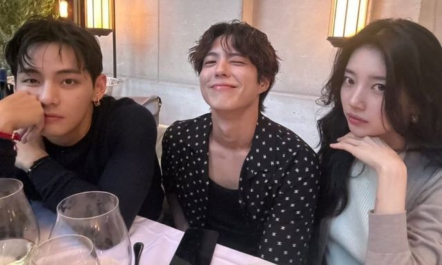 사진 속 수지와 박보검, 뷔와 함께한 모습이다. 이들은 지난 6일 파리에서 진행된 한 명품 브랜드 행사에 참석했다. 시선을 끄는 조합으로 한 프레임에 담긴 이들은 식사를 하며 셀카를 찍은 모습이다. 박보검을 가운데 두고 양옆에 자리한 수지와 뷔는 빛나는 비주얼로 카메라를 응시했다.