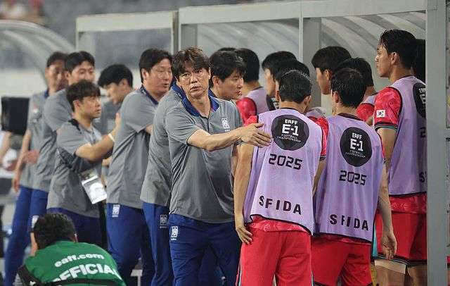 홍명보 대한민국 축구 국가대표팀 감독이 지난 7일 오후 경기 용인시 처인구 용인미르스타디움에서 열린 2025 동아시아축구연맹(EAFF) E-1 챔피언십 남자부 대한민국과 중국의 경기에서 3대0으로 승리 후 선수들을 격려하고 있다 / 뉴스1