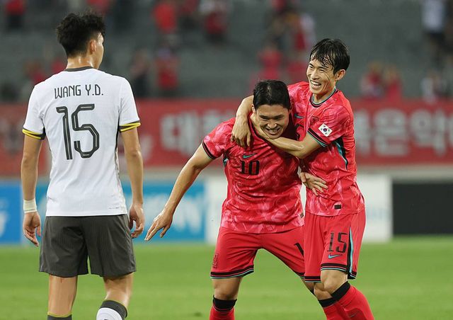 대한민국 축구 국가대표팀 선수들이 지난 7일 오후 경기 용인시 처인구 용인미르스타디움에서 열린 2025 동아시아축구연맹(EAFF) E-1 챔피언십 남자부 대한민국과 중국의 경기에서 3대0으로 승리 후 기뻐하고 있다 / 뉴스1