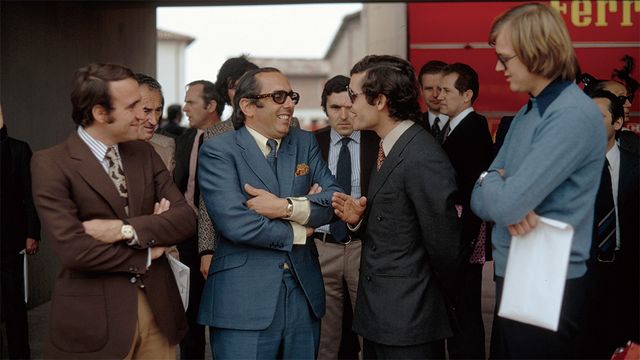 1970년대 페라리 팀과 대화중인 잭 호이어(두번째 파란 수트)의모습.